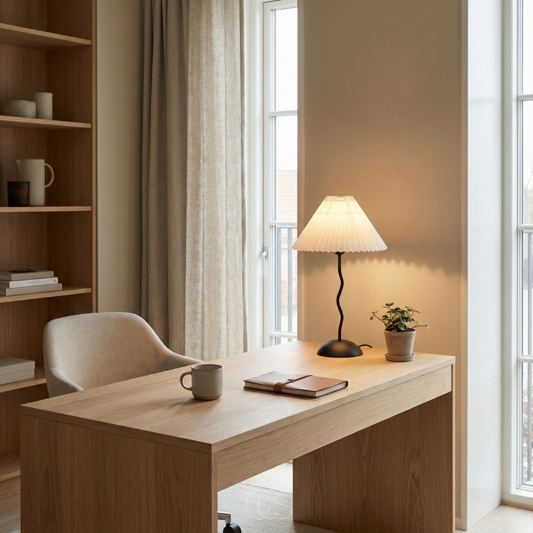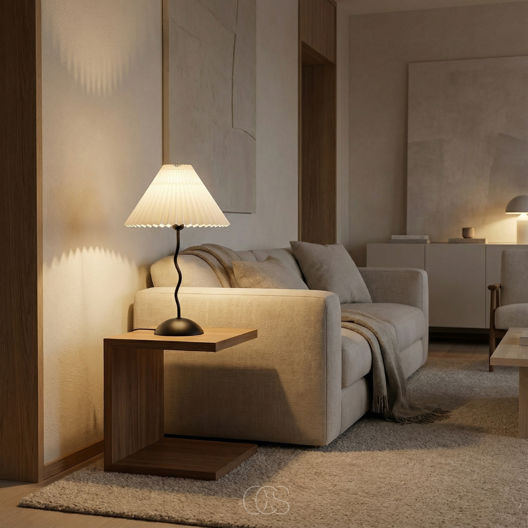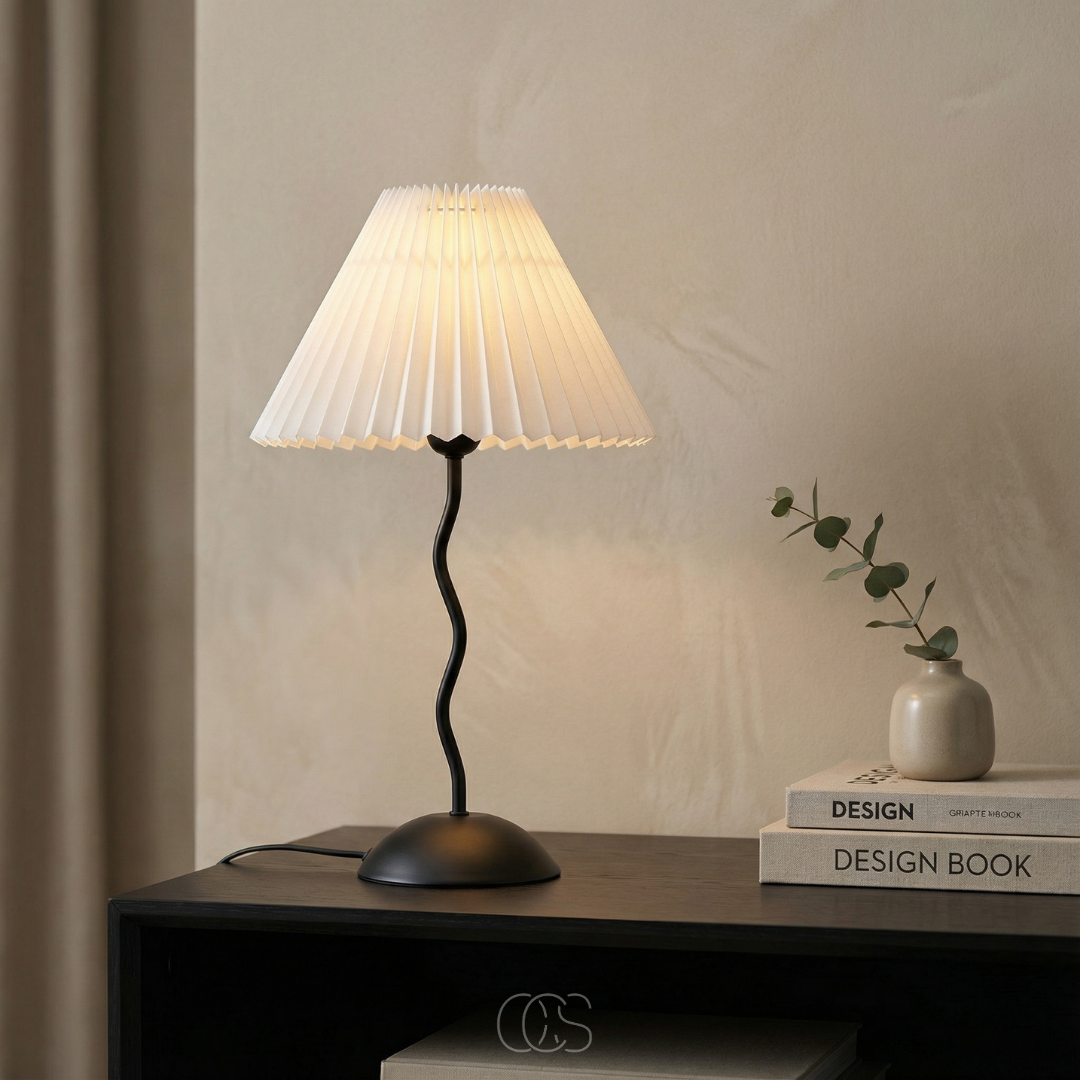 De kronkly tafellamp is precies dat soort toevoeging. Niet luid aanwezig, maar wel onmisbaar zodra hij er staat. De speelse, golvende voet trekt subtiel de aandacht, terwijl de geplooide kap het licht verzacht tot een warme gloed die je meteen rust geeft.