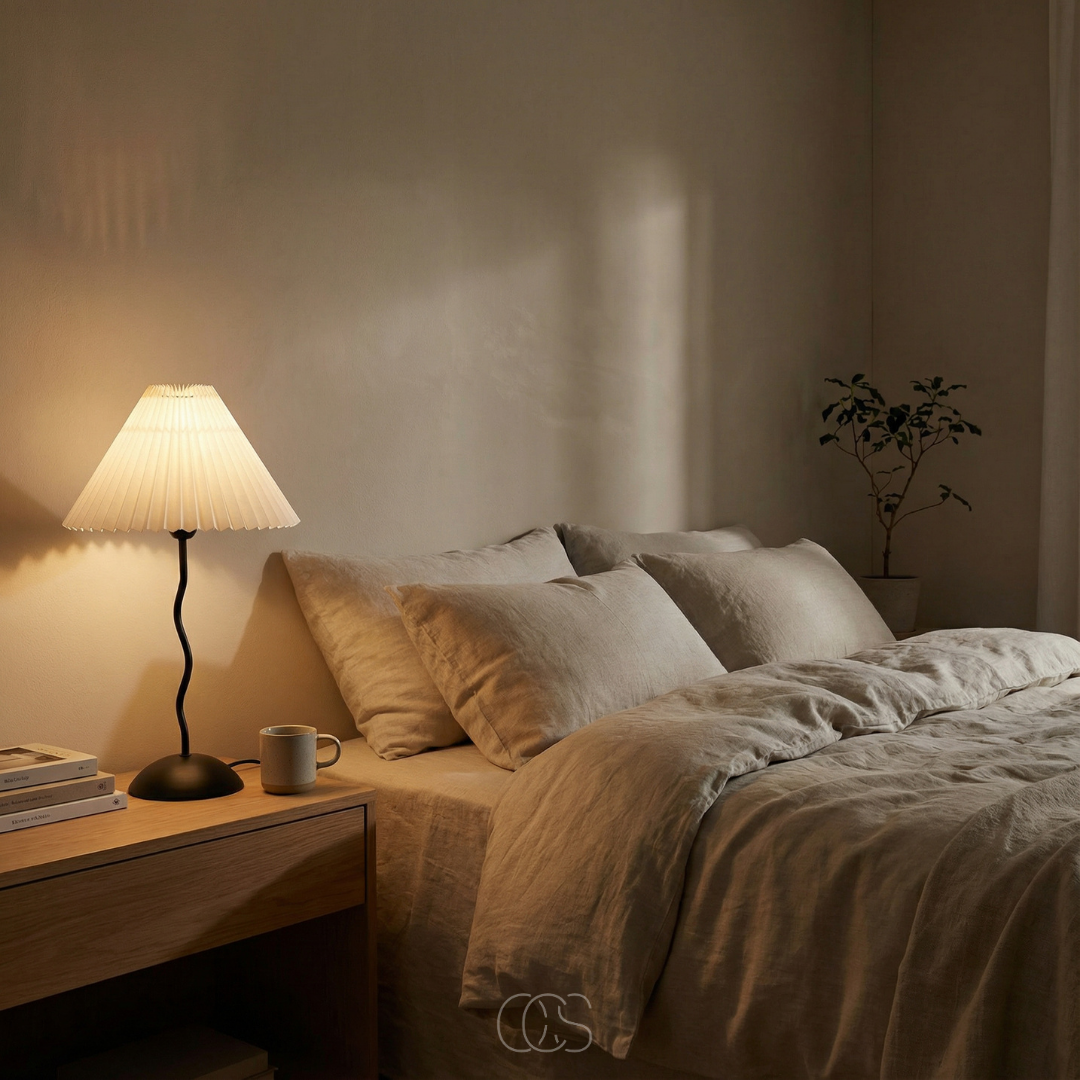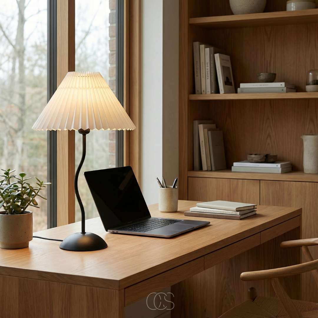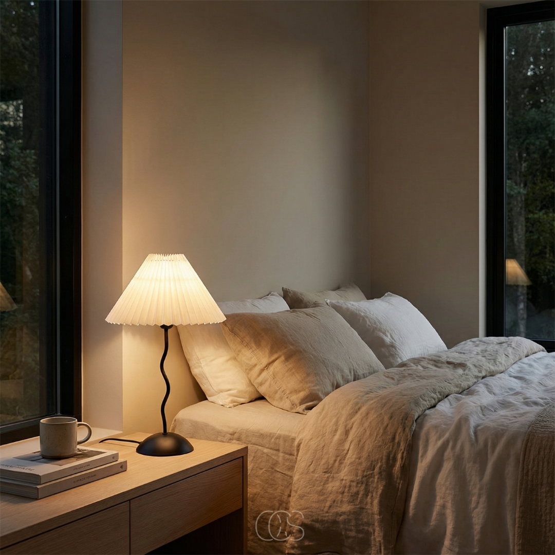De kronkly tafellamp is precies dat soort toevoeging. Niet luid aanwezig, maar wel onmisbaar zodra hij er staat. De speelse, golvende voet trekt subtiel de aandacht, terwijl de geplooide kap het licht verzacht tot een warme gloed die je meteen rust geeft.